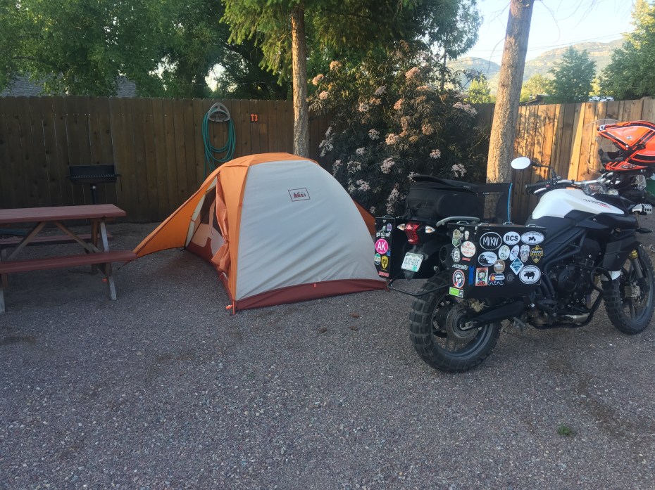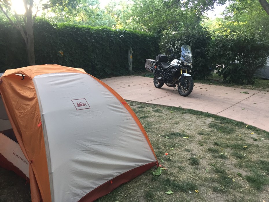 Day 2 – Salt Lake City KOA … I had to take a small southern detour to visit the Triumph dealer in Salt Lake. Had to replace my bald rear tire. It was done.
