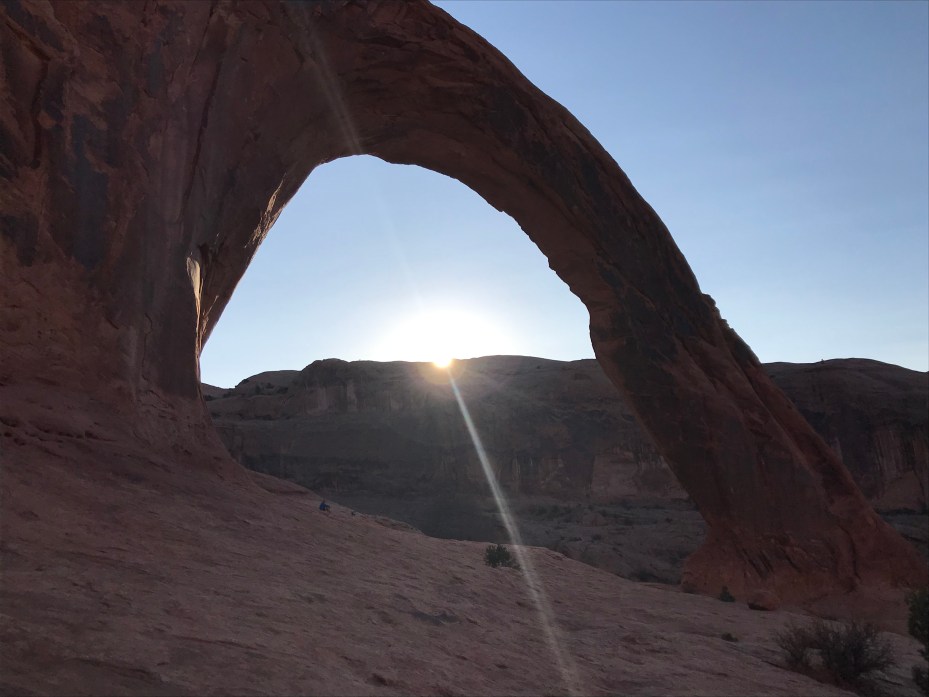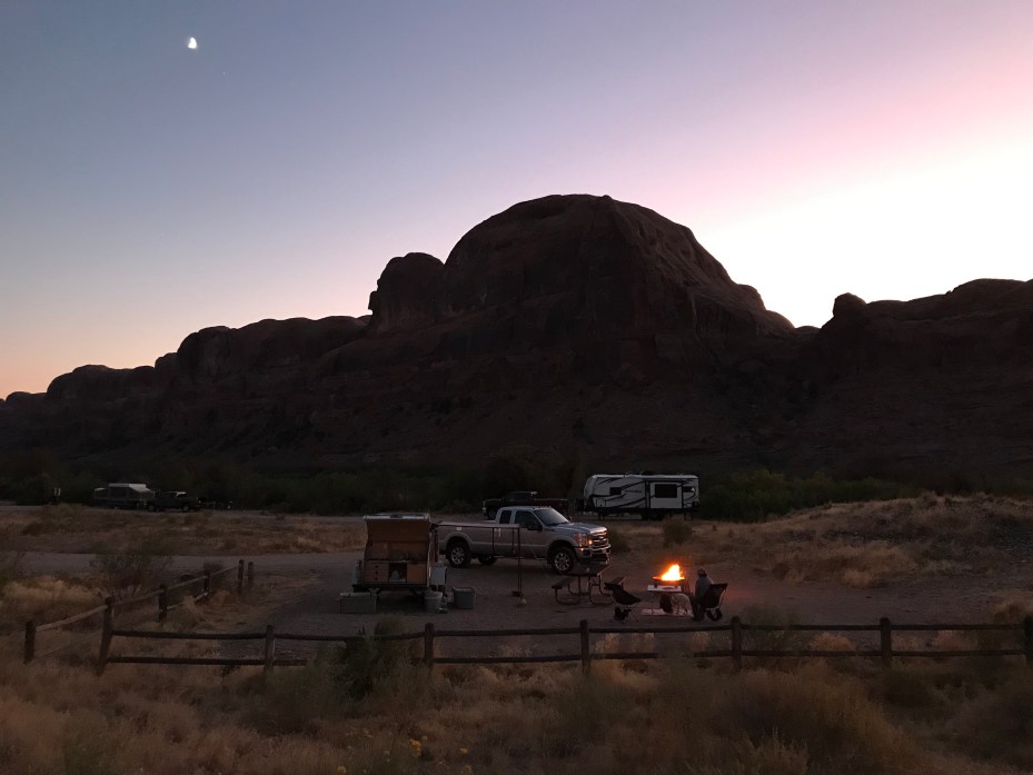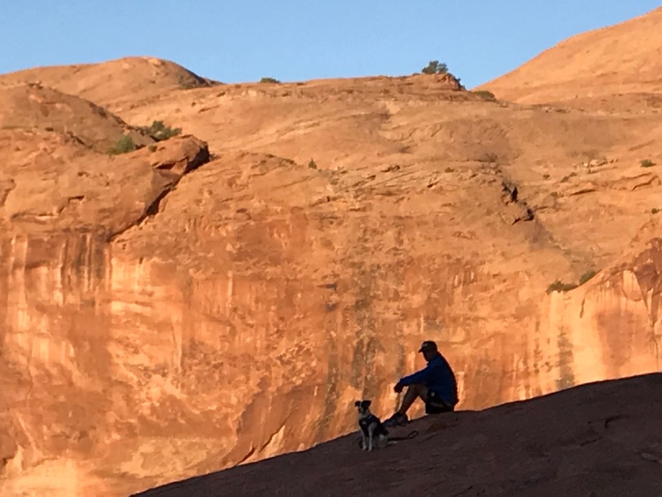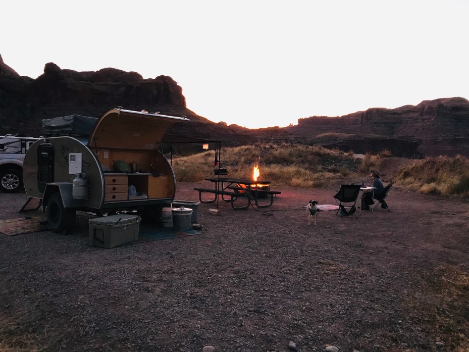 October 2 – 4 | On our days off this week we decided to go out into the BLM lands and spend a little time in the quiet surroundings of Moab. I am always looking at the latest trailers and campers to find that next one that would be cool enough to buy, and I came across a small company here in Moab that rents teardrop trailers. Red Rock Base Camps will rent you a fully stocked trailer and deliver it to your campsite. So all you have to do is show up and start enjoying the evening. So we grabbed a site in Gold Bar Campground and had the trailer delivered. It was awesome. And since the Corona Arch Trail is right across the street, we hiked the trail with Xena the next morning.